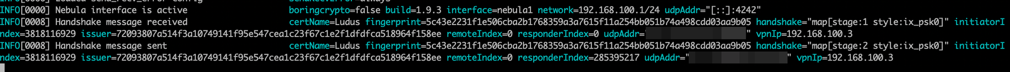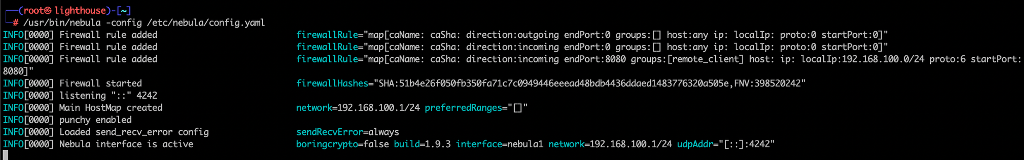 ca.crt config.yaml host.crt host.keyOnce you have your hosts and lighthouse server ready, time to test this out! Run ./nebula -config /etc/nebula/config.yaml on the Ludus server and the Lighthouse server. You should see something like this: