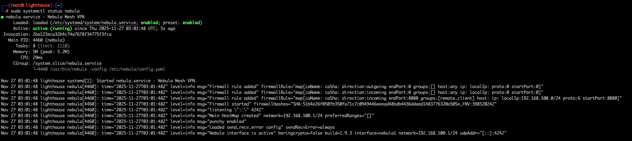 Now your Nebula service will always be running and waiting for your connection on the go. Now is the time to go and play with some of the awesome settings found within the config files. To reload the service, simply run sudo systemctl reload nebula or manually via the PID sudo kill -HUP $(pgrep nebula) .