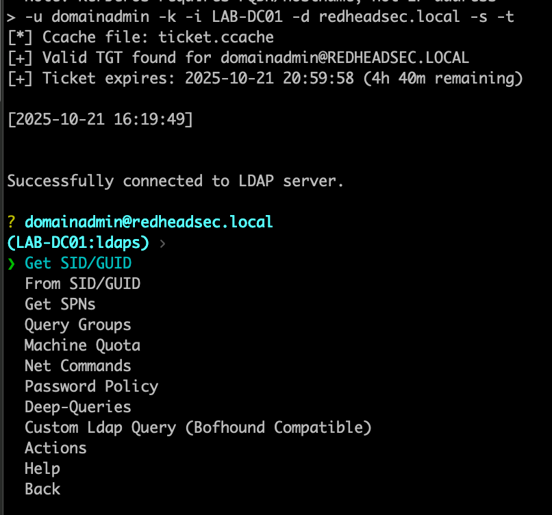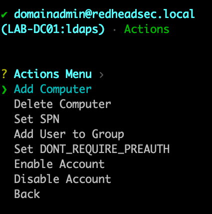 The new actions menu now allows the user to perform certain modifications using LDAP such as add a computer, set a SPN, set DONT_REQUIRE_PREAUTH, and enable/disable accounts. Under the right context, these can lead to further attacks and compromise of environment when using the Kerberos module or third party tools.