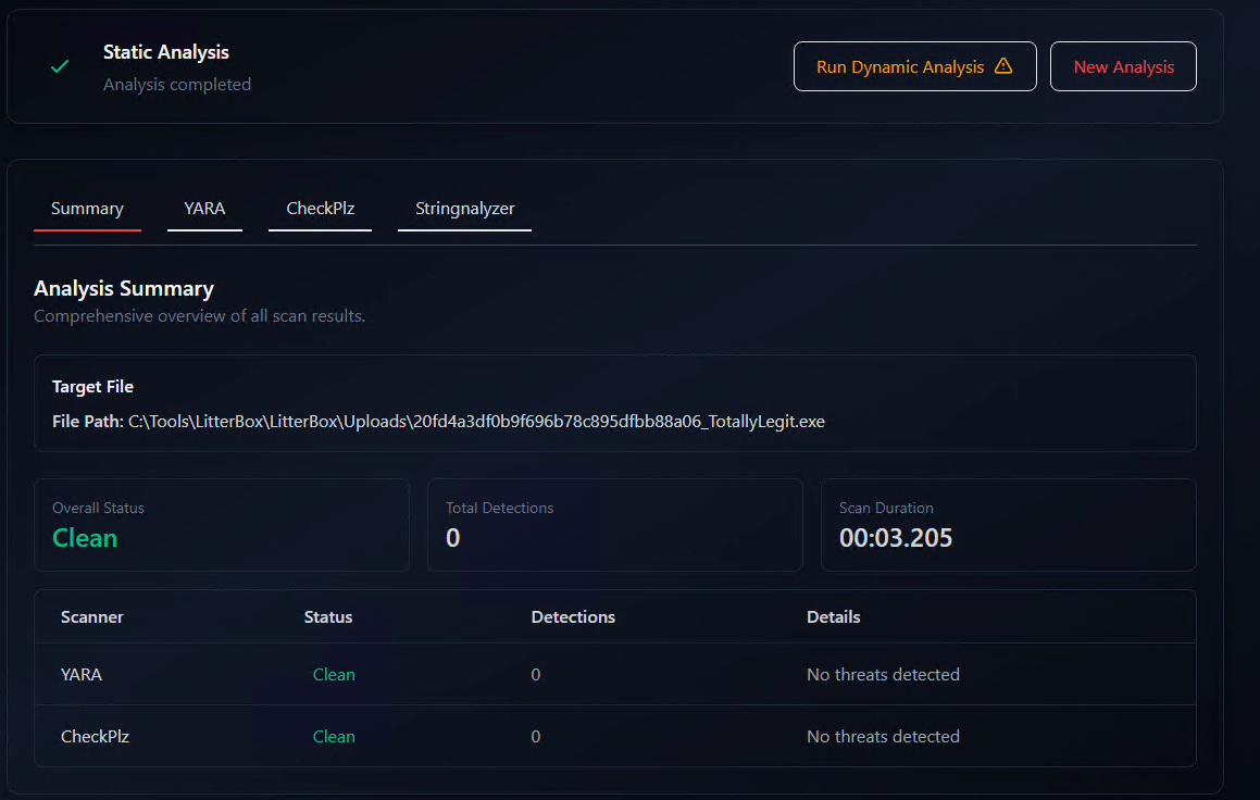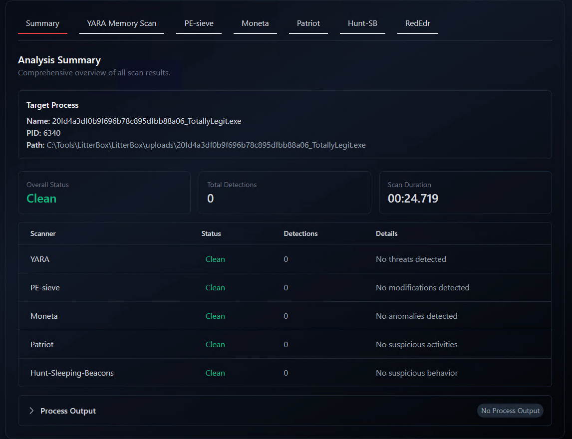 Let's compile a binary with RC4 encryption, early-bird APC injection, and simple sleep commands along with some binary padding. We can then run this through LitterBox to see if we have any detections off the bat.